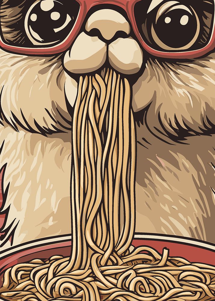 Ce motif humoristique montre un alpaga duveteux avec de grosses lunettes rouges, qui mange avec plaisir un bol de ramens. La scène est illustrée dans un style rétro riche en détails, avec des couleurs vives et un arrière-plan ludique de montagnes, de nuages et de coucher de soleil. La combinaison d'un animal mignon, d'un accessoire moderne et d'un repas inattendu confère à l'image une note d'humour unique et un charme artistique.