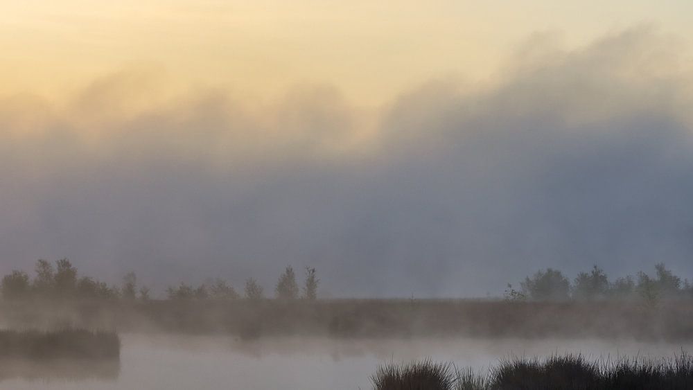 Après une nuit froide, une belle journée ensoleillée nous attend. Le soleil levant crée un mélange de couleurs chaudes et froides dans le ciel qui se reflète dans l'eau. Tout est un peu flou à cause de la brume. Cela donne une merveilleuse atmosphère mystique à la matinée.