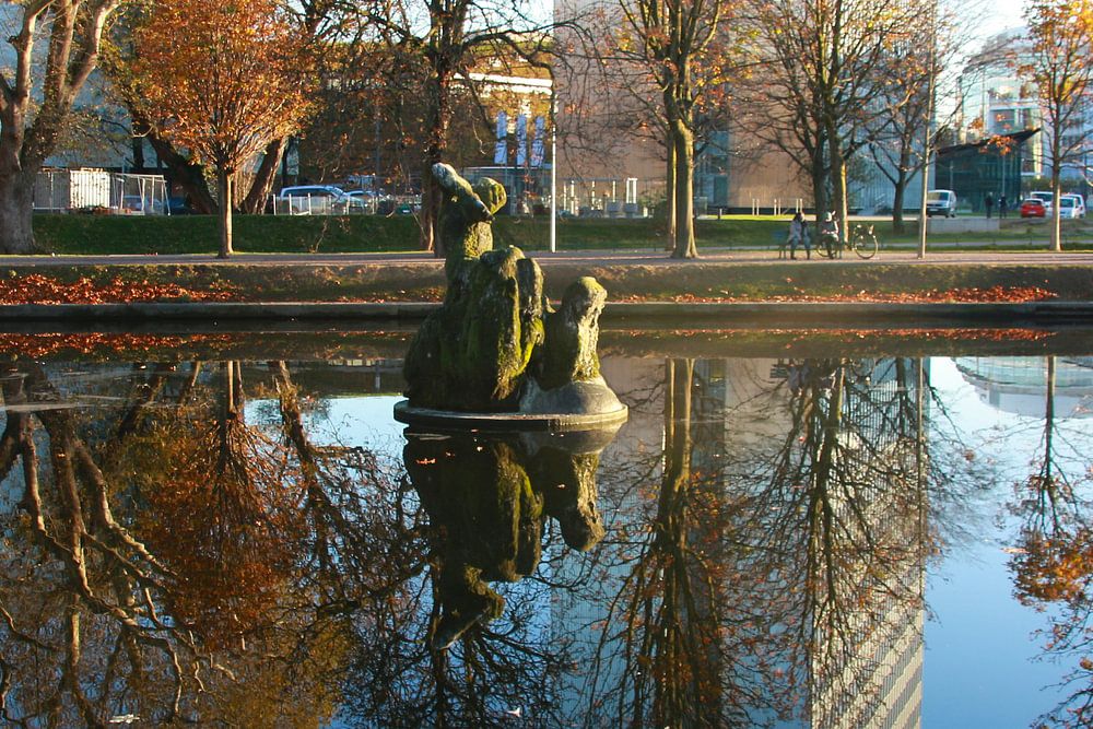 Düsseldorf dans le Hofgarten à Jröne Jong, l'opéra, Dreischeibenhaus et Köbogen.