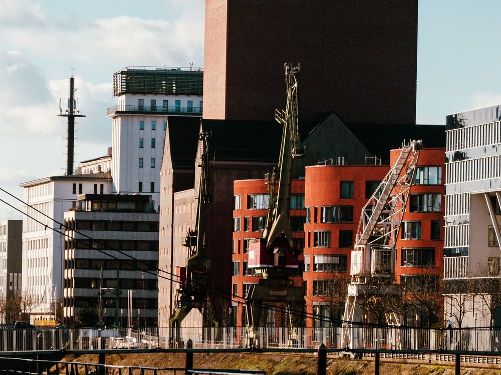 Vue vers l'extérieur depuis le port intérieur de Duisbourg.