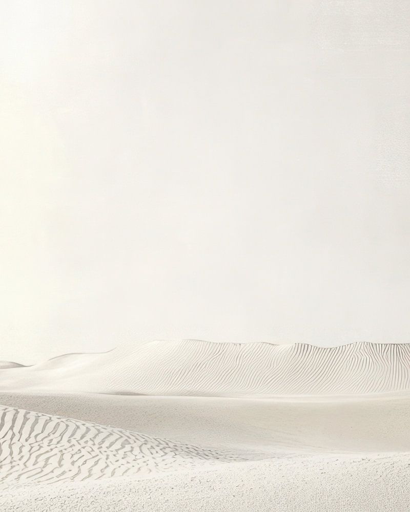 Une œuvre d'art sereine et minimaliste représentant un paysage désertique paisible dans des tons doux, presque monochromes. Les textures subtiles des dunes de sable sont élégamment rendues, évoquant un sentiment de tranquillité, d'intemporalité et de vide méditatif. Cette œuvre d'art convient parfaitement aux intérieurs qui privilégient le calme, l'espace et la simplicité - du minimalisme scandinave au minimalisme japonais. Une œuvre puissante qui vous invite à ralentir et à rester immobile.