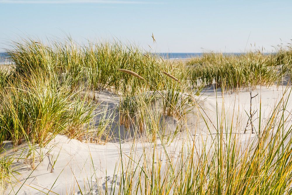 La plage de sable fin, le ciel bleu et la belle herbe de plage forment la plage de rêve de Norderney.