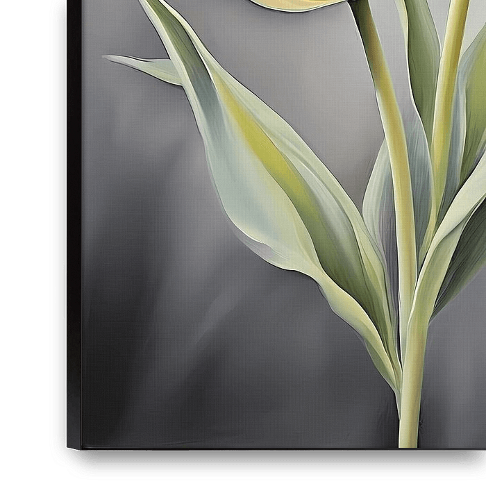 Cette œuvre d'art capture la beauté délicate de deux tulipes jaunes en pleine floraison. Les pétales d'un jaune tendre et beurré, avec de subtiles touches de rose et de blanc, se déploient gracieusement, illuminés sur un fond gris discret. Les tiges douces et élancées et les feuilles vertes légèrement incurvées ajoutent à l'élégante…