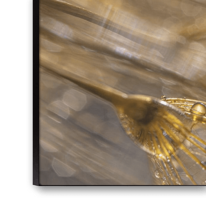 Cette photo "Duvet d'or avec des gouttelettes qui scintillent dans la lumière" ; est une photo macro d'une petite partie du bulbe duveteux d'un Tragopogon. (Aux Pays-Bas, le Tragopogon est également appelé Morgenster).