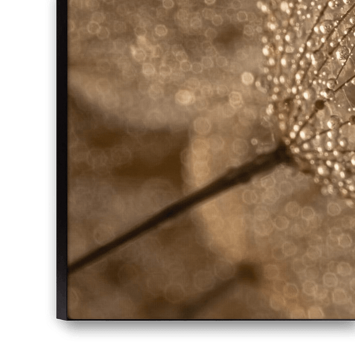 "Duvet doré dans la lumière" est une photo macro de gouttelettes d'eau sur le duvet de graines d'une étoile du matin (Tragopogon). Cette photo (éditée) a principalement des tons bruns et une couleur champagne. En raison de la lumière chaude, le duvet semble avoir un éclat doré. L'arrière-plan semble être marbré de brun foncé.