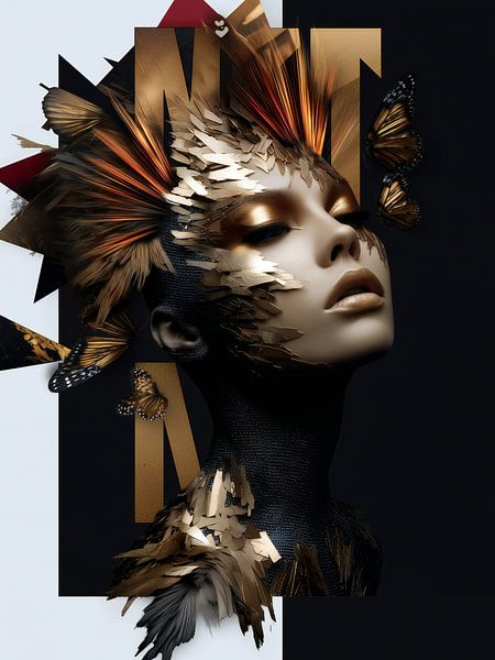 Portrait abstrait en techniques mixtes avec des accents dorés et cuivrés