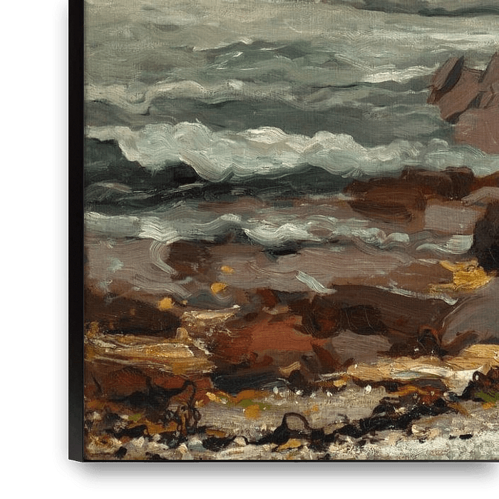 Eastern Point, Winslow Homer Homer a réalisé Eastern Point en seulement un mois, capturant avec assurance les conditions météorologiques tumultueuses près de son atelier dans le Maine. Les vagues, peintes avec vigueur dans des tons de bleu-vert profond et de blanc opaque, s'agitent sous un ciel gris menaçant. Des rochers émergent de la plage jonchée de varech, leurs surfaces irrégulières soulignées par des touches de rouge, d’ocre et de jaune. Lorsque ce tableau fut exposé en 1901, un critique new-yorkais le qualifia de « presque aussi vivant qu’une promenade rapide le long du rivage par temps d’orage ».