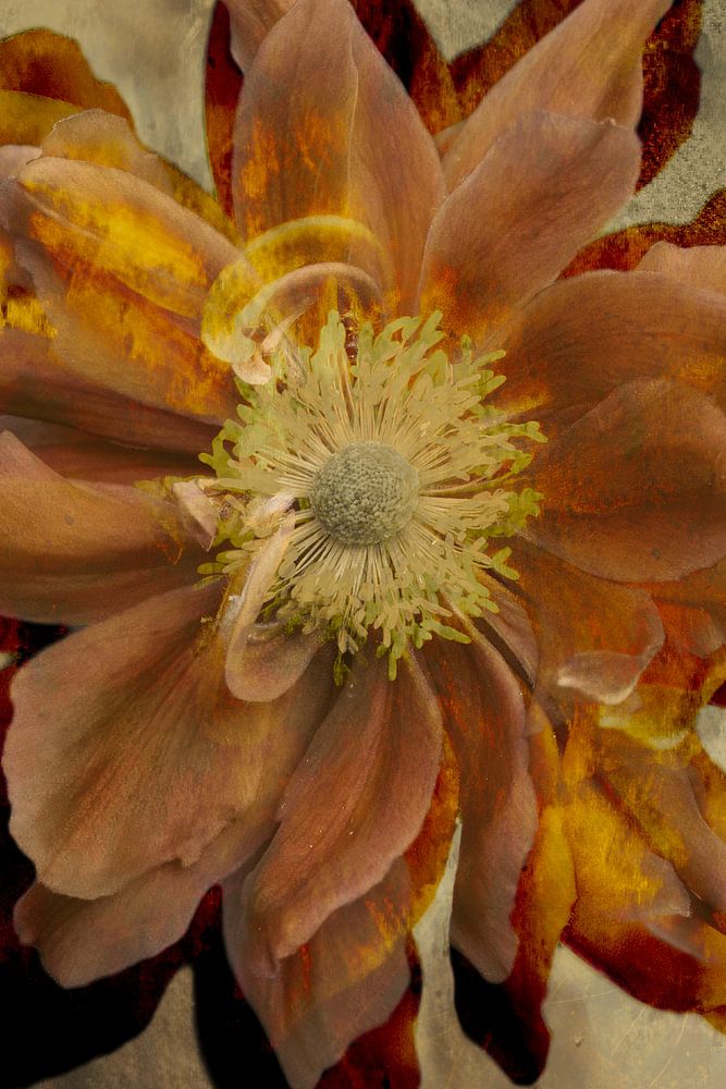 Photo d'art numérique à l'aspect chaud et usé. Une fleur superposée dans des tons cuivre et ocre prend vie sur un fond nostalgique. Cette œuvre d'art de Saranda Veld ArtWorks apporte un sentiment d'intemporalité et de tranquillité à tout intérieur. Elle est parfaite comme décoration murale dans les intérieurs naturels ou vintage.