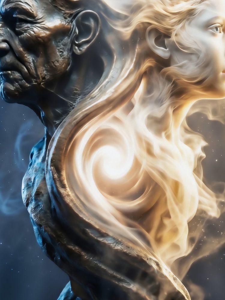 Deux visages se dessinent dans le brouillard épais de l'éphémère. L'observateur sage, marqué par les éons et enveloppé dans l'ombre stoïque de la pierre froide, contemple imperturbablement les profondeurs du passé. Tourné vers l'opposé, mais pourtant indissociablement lié, le visage immaculé de la jeunesse capte la lumière dorée la plus pure. Entre les deux tourbillonne sans cesse l'étincelle éternelle de la vie – une transformation infinie où le commencement et la fin se rejoignent pour former un cercle parfait.