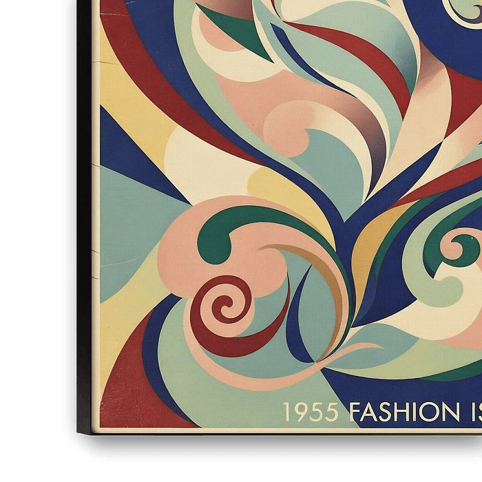 La palette de couleurs - des bleus riches, des crèmes discrètes, des rouges audacieux et des verts éclatants - a été choisie pour évoquer l'optimisme et la sophistication de la période du milieu du siècle. Les motifs géométriques et curvilignes reflètent la fascination de l'époque pour l'innovation, le mouvement et l'expérimentation artistique. Les textures subtiles et les tons vintage ajoutent un sentiment de nostalgie, comme si cette image avait traversé le temps pour raconter son histoire.