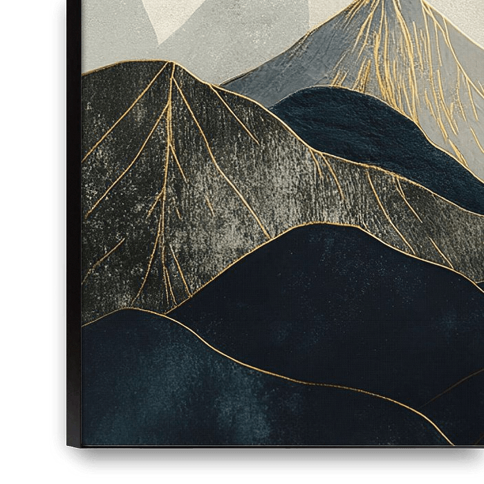 Illustration abstraite d'un soleil doré au-dessus des montagnes, avec des accents de feuille d'or, des couleurs bleu foncé et bleu-vert, des formes géométriques et un aspect structuré.