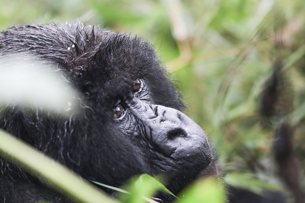 Lors d'une randonnée dans les forêts tropicales du Rwanda, j'ai aperçu ce gorille, perdu dans sa contemplation. Allongé au milieu de la dense verdure, il semble réfléchir aux mystères de son monde. Ses yeux, pleins de sagesse et de tranquillité, fixent rêveusement un point invisible au loin. Au milieu du feuillage vibrant, il crée une scène sereine, témoin silencieux de la beauté intemporelle de la nature.