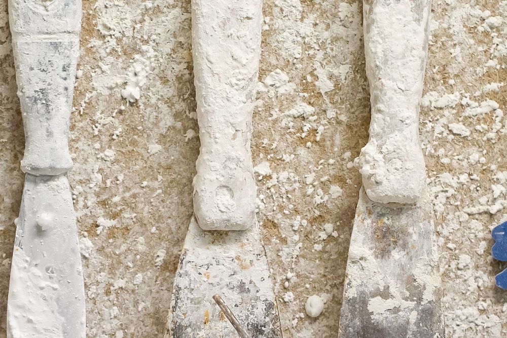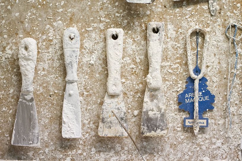 Nature morte d'une scène d'atelier. Bien accrochés au mur, éclaboussés et maculés, les morceaux d'outils attendent de faire leurs preuves entre les mains d'un utilisateur averti.