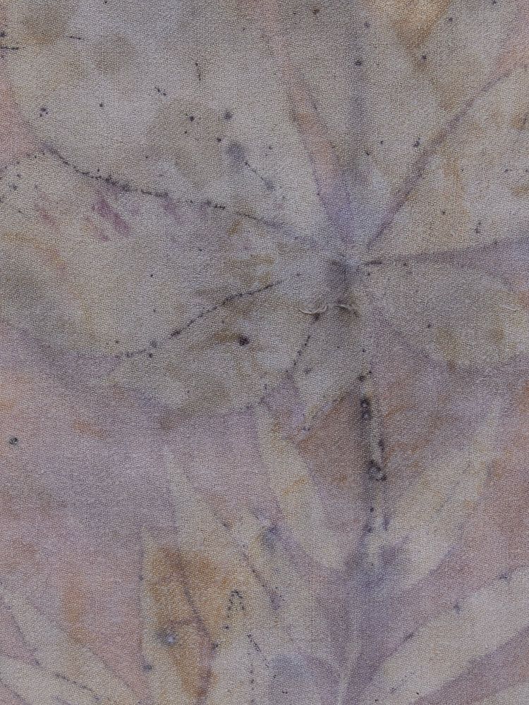 Cette impression écologique inhabituelle et stratifiée est réalisée, entre autres, à partir d'une feuille de châtaignier. À la base, il y a de l'herbe de pêche et au sommet, des mûres flottantes. Dans cette technique, je laisse la plante, dans un bain de vapeur, faire une empreinte sur du tissu ou du papier. Dans ce cas, sur une douce flanelle de coton, ce qui explique aussi pourquoi l'image est si magnifiquement diffuse. Lorsque j'ai réalisé cette impression, c'était vraiment une surprise !