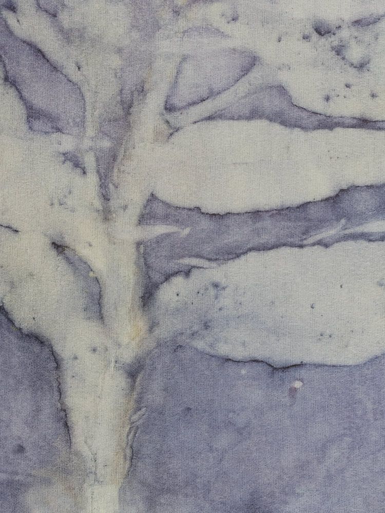 Elle a fait l'objet d'une éco-impression particulière. On pourrait même dire qu'elle a échoué.....car la plante elle-même n'a pas laissé d'empreinte, mais elle a laissé une très belle silhouette ! L'impression est réalisée sur une flanelle de coton doux, l'expression de ce tissu est joliment reflétée dans l'image. La couleur bleue délavée provient du pigment naturel bluewood utilisé pour réaliser l'écoprint.