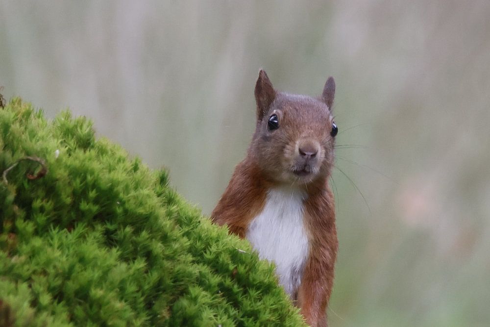 Une photo touchante d'un jeune écureuil qui attend des friandises. Le petit animal se tient droit, à moitié caché derrière un dos couvert de mousse, comme s'il pouvait frapper à n'importe quel moment. Ses oreilles dressées captent tous les sons, tandis que son regard et son museau reniflent l'air avec curiosité, à la recherche de friandises cachées.