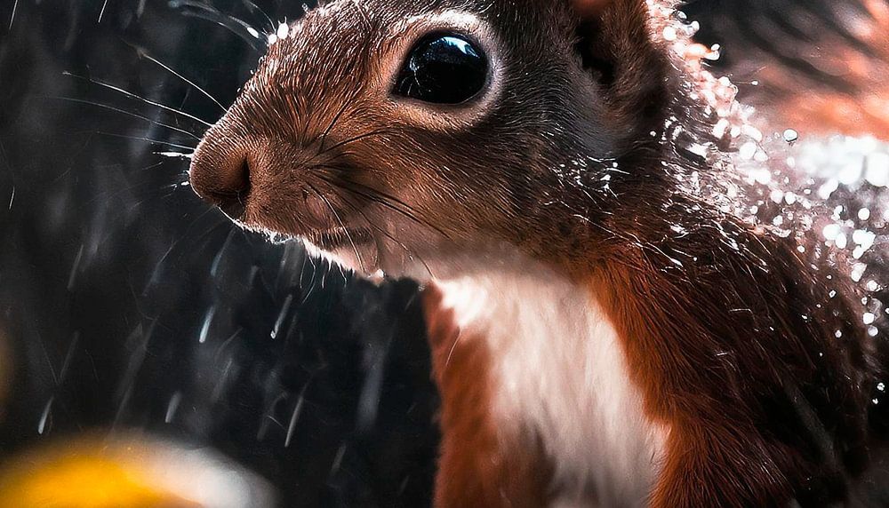 Écureuil sous la pluie avec gouttes de pluie et abstrait