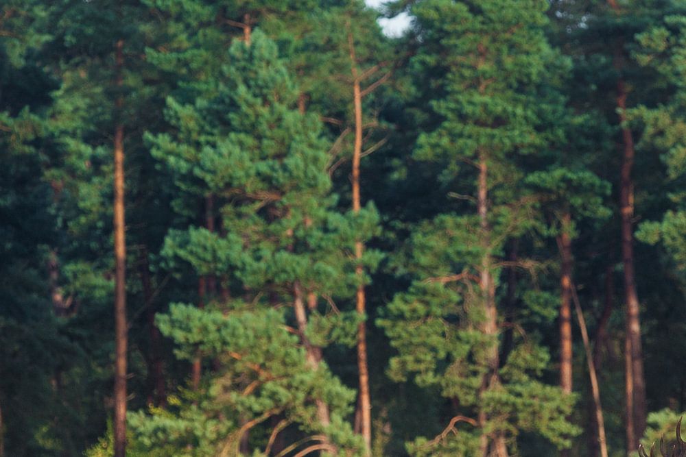 Mannelijk Edelhert staat op de hei met de bosrand op de achtergrond