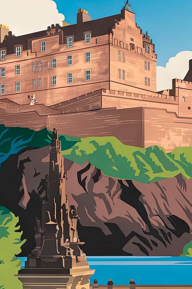 Le château d'Édimbourg trône majestueusement au-dessus de la ville, entouré de douces collines et d'eaux d'un bleu profond. Les couleurs claires et les formes marquées capturent l'ambiance historique et la beauté intemporelle de l'Écosse. Un gardien solitaire se tient devant l'imposant édifice et invite à explorer les histoires des temps passés.