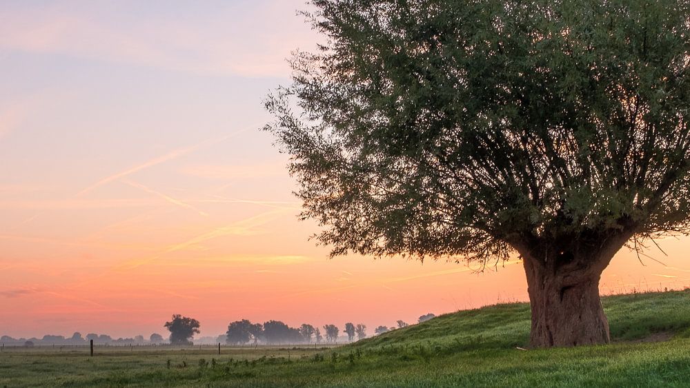 Een uitgestrekt weiland. In de verte zijn nog wat bomen, maar deze boom staat heel alleen te pronken. De lucht kleurt prachtig, terwijl de zon op het punt staat door te komen.