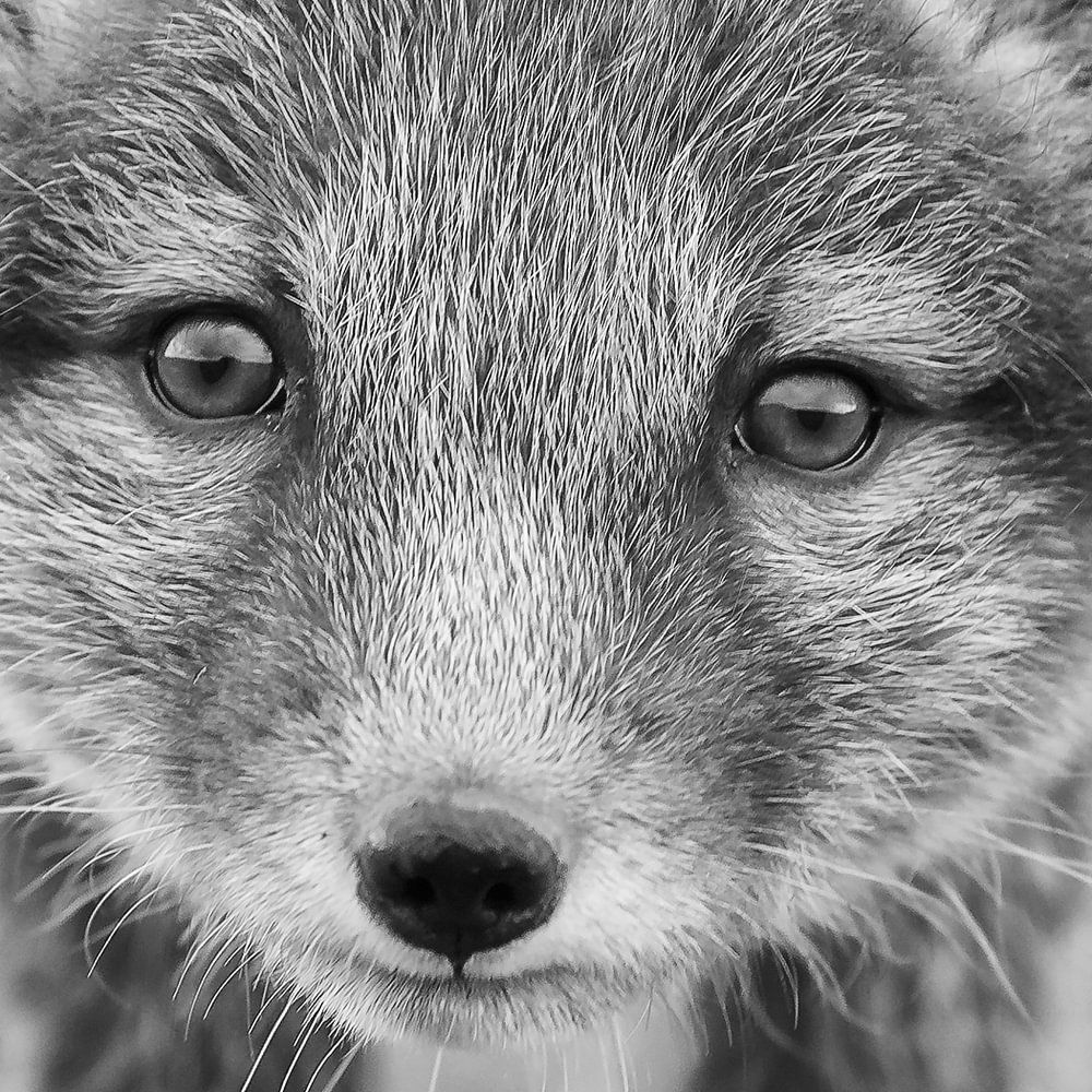 Een jonge nieuwsgierige poolvos van ongeveer 6 weken oud kijkt in de lens.