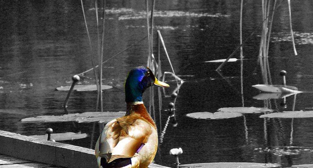 Fotografie in kleur van een eend op uitkijk bewerkt door de omgeving in zwart wit te maken.