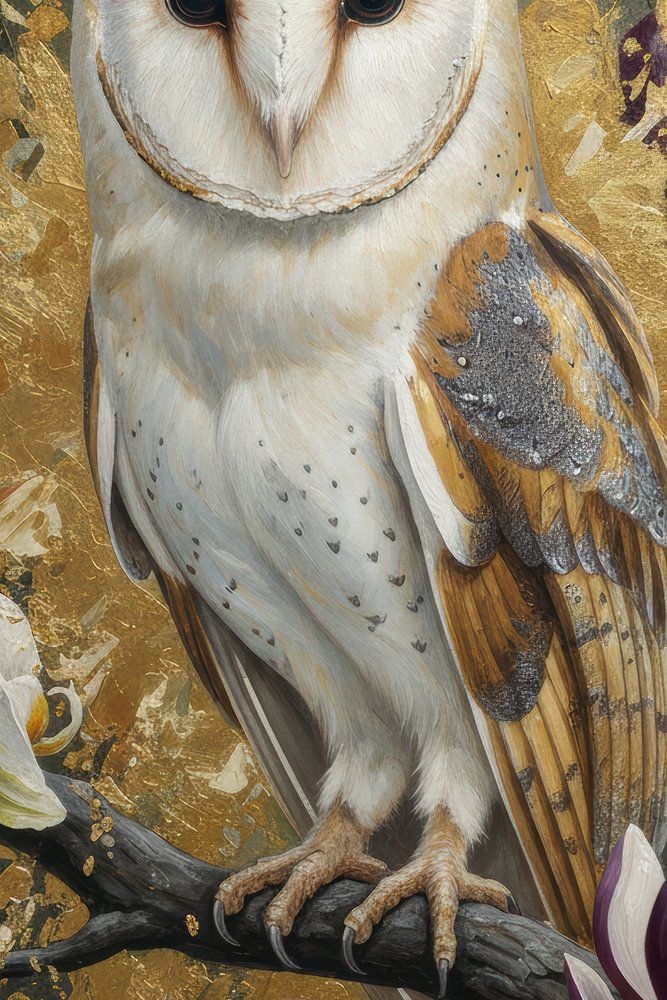 Apportez calme, mysticisme et luxe à votre intérieur avec cette pièce représentant une belle chouette effraie. Les plumes détaillées, les tons chauds de la terre et les accents dorés confèrent à cette pièce un aspect élégant.