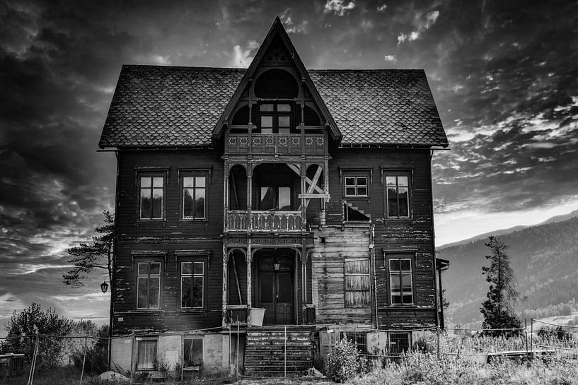 Vieille maison en bois abandonnée au bord d'une route de campagne en Norvège