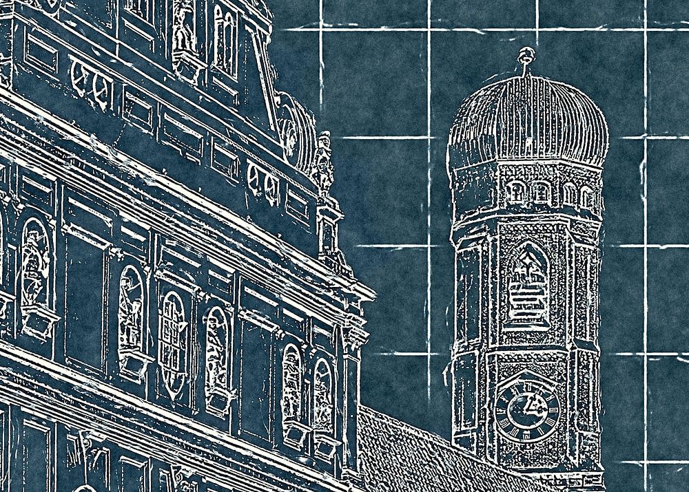 Graphisme de style blueprint représentant l'église Renaissance Saint-Michel avec la tour de la cathédrale "Zu Unserer Lieben Frau" en arrière-plan dans la vieille ville de Munich, Allemagne