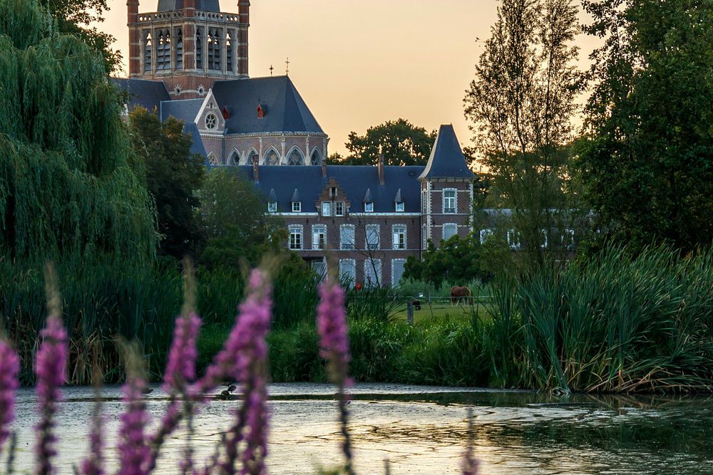 L'église Dadizele du parc adjacent. Fleurs au premier plan. Grand bassin