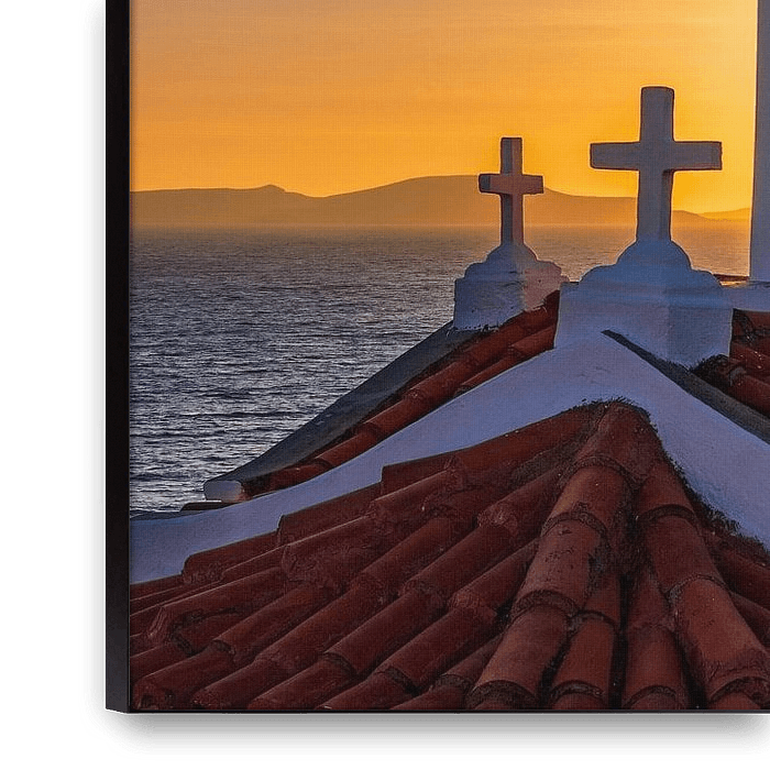 Achetez cette photo Église grecque au coucher du soleil par Michel Seelen sur toile, aluminium, ArtFrame ou photographie (encadrée), impression d'art en haute qualité et tout format.