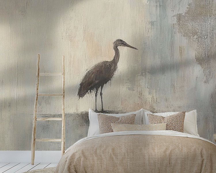 Egret | Egret dans les tons de terre - Ce tableau représente un grand oiseau, une aigrette, se tenant tranquillement sur un fond lisse avec un arrière-plan léger et abstrait dans les tons de terre.