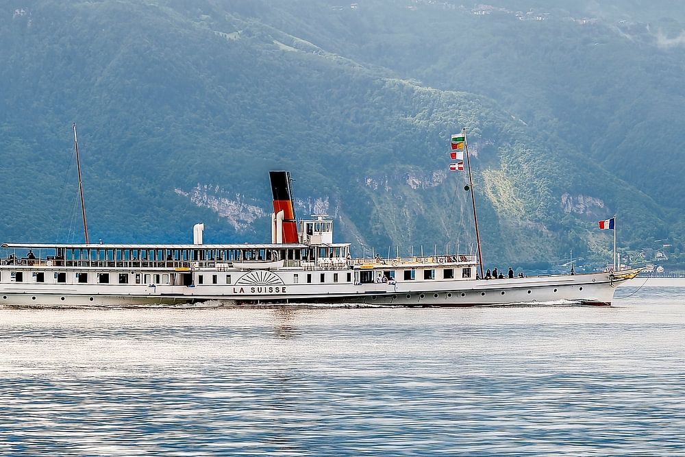 El buque a vapor La Suisse durante su navegación por el lago Lemán (Suiza) en un día nublado de verano. La imagen fue captada desde otro barco del mismo tipo. Las nubes enganchadas a los Alpes contribuyen a crear una atmósfera etérea y mística.