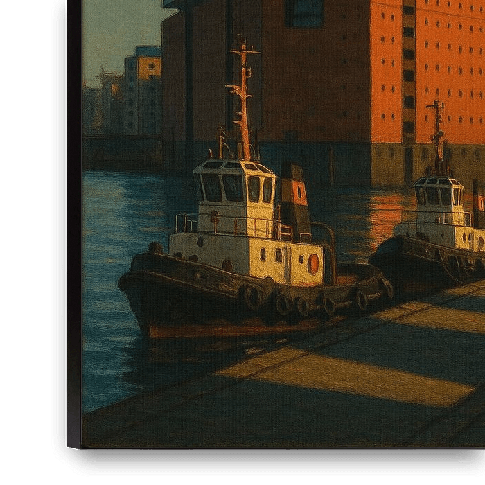 Achetez cette œuvre d'art de paysage Elbphilharmonie au coucher du soleil : Vagues de verre et remorqueurs de port par Travel Shop sur toile, aluminium, ArtFrame ou photographie (encadrée), impression d'art en haute qualité et tout format.