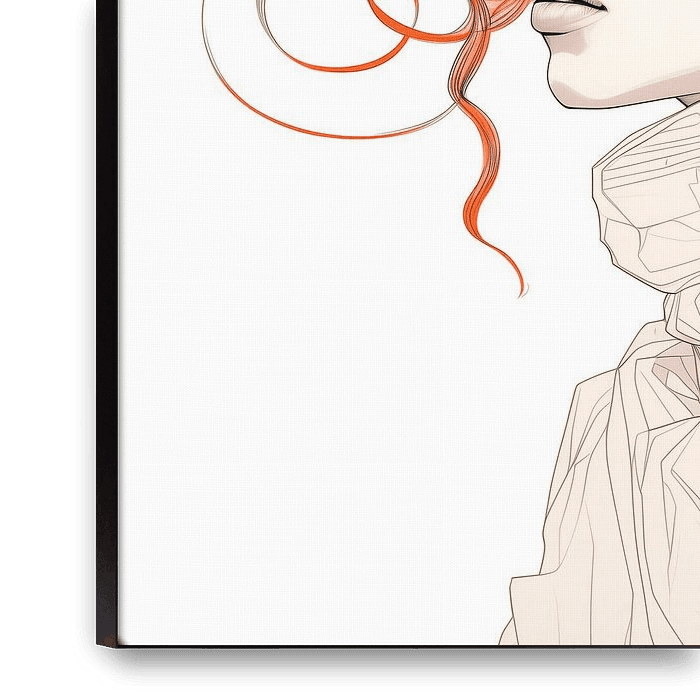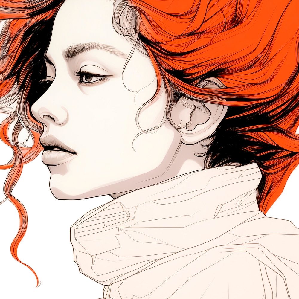 Portrait d'une femme aux cheveux orange ondulés et vibrants, à l'allure sauvage et dynamique. Elle est vêtue d'une robe blanche douce et surdimensionnée, à la texture légèrement froissée, qui dégage une impression d'élégance décontractée. Le style d'illustration épuré et moderne, combinant des dessins au trait et des ombres de couleur…