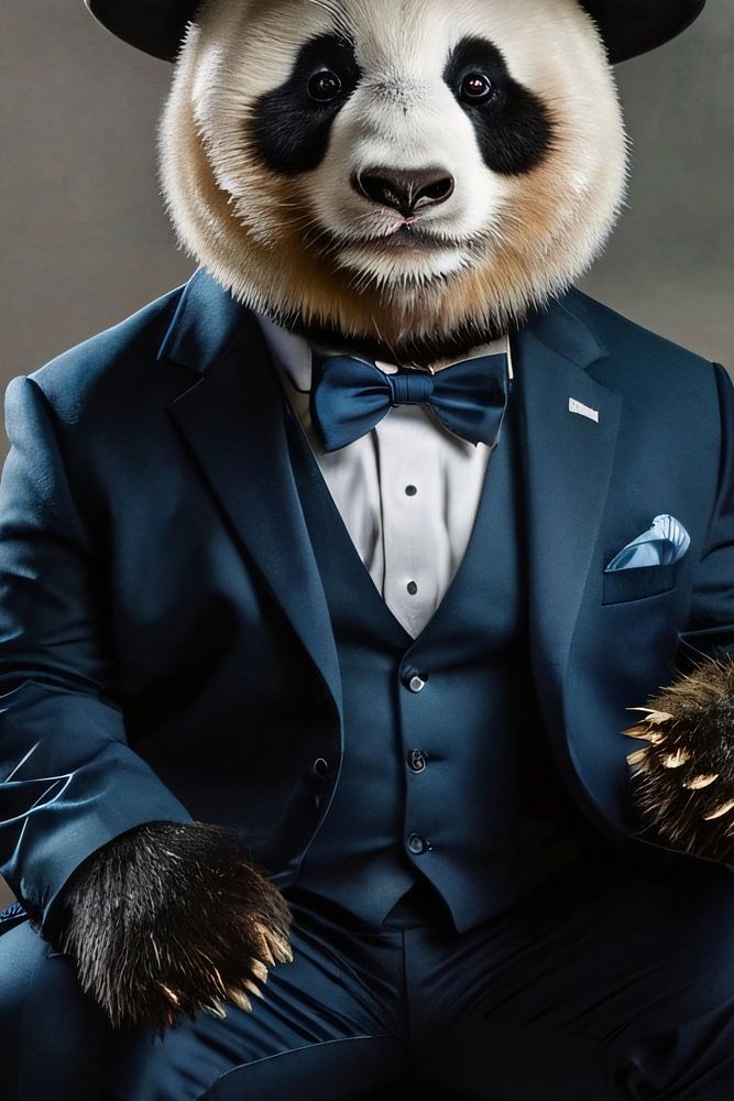 Cette image unique montre un charmant panda vêtu d'un élégant costume bleu et coiffé d'un chapeau assorti. La combinaison de l'élément animal et de l'élément humain crée un dessin ludique et étonnamment surréaliste. Le costume sophistiqué aux lignes nettes et les accessoires élégants tels que le chapeau donnent au panda une apparence presque humaine, mais les griffes contrastantes et le visage mignon nous ramènent au monde naturel. Ce motif, qui respire la créativité et l'humour, serait parfait comme œuvre d'art décorative pour un bureau ou un espace de vie. Il ne manquera pas de faire sourire les spectateurs et d'engager la conversation avec les invités.
