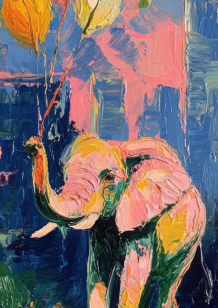 Cette peinture à l'huile représente un éléphant tenant des ballons devant l'Empire State Building et le skyline de New York. Une palette de couleurs roses et jaunes crée une ambiance joyeuse et chaleureuse. Des coups de pinceau lâches de style impressionniste confèrent dynamisme et vivacité. La composition associe une représentation animale ludique à une architecture urbaine, la skyline étant abstraite mais reconnaissable. Des couleurs claires, des transitions douces et une peinture expressive créent une scène vivante et charmante qui capture le mouvement, la joie et l'atmosphère unique de New York.