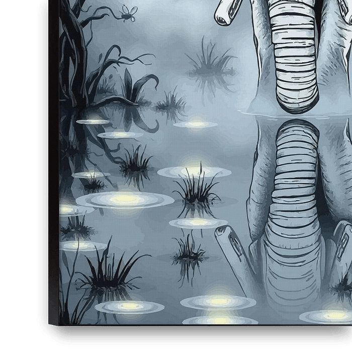 Un éléphant calme se tient dans un marais couvert de brume, entouré de reflets doux et de tons sourds qui créent une ambiance calme et cinématographique. Un léger brouillard dérive sur l'eau, donnant à la scène profondeur et mystère. Cette œuvre d'art plaît aux clients qui apprécient les décors tranquilles inspirés de la nature. Sa…