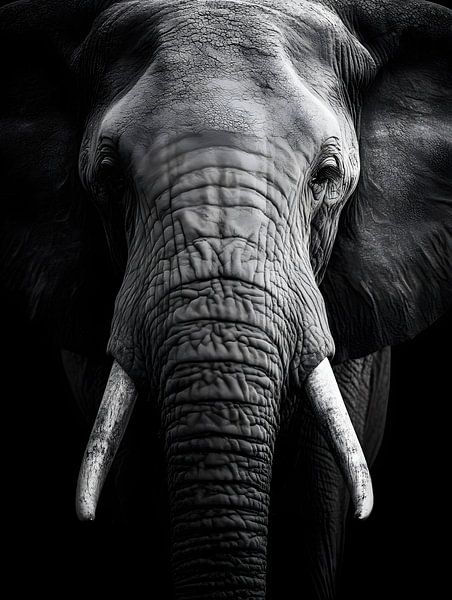 Ce portrait impressionnant en noir et blanc montre un éléphant vu de face et met l'accent sur la structure impressionnante de sa peau et sur le rayonnement calme et puissant de l'animal. Les fines rides, les ombres profondes et les forts contrastes confèrent au sujet une profondeur et une présence exceptionnelles.