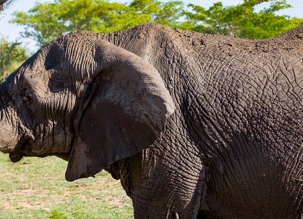 Éléphant pulvérisant de la boue dans un beau jet enroulé, montrant la puissance de la trompe et son efficacité.