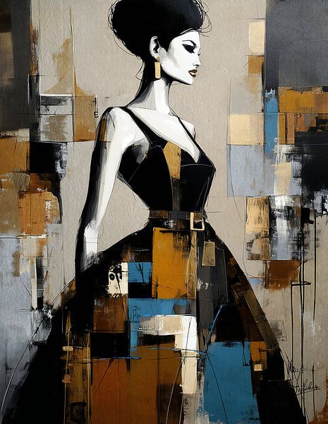 Illustration portrait d'une femme dans des tons ocres avec une texture grunge grossière sur papier.
