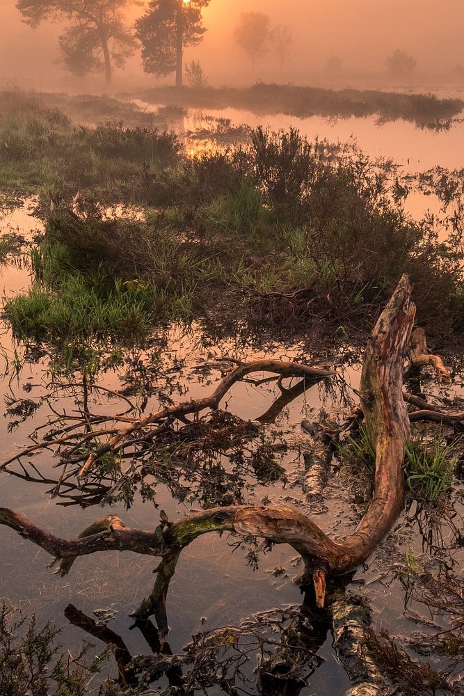 La pluie est tombée en abondance et le Leersumse Veld a été complètement inondé. L'abondance de l'eau de pluie, la brume et le magnifique lever de soleil ont fait de ce moment un moment magique. La souche au premier plan complète l'image.