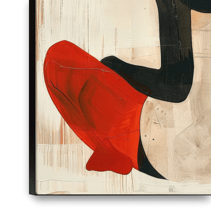 Les lignes puissantes de la silhouette sont rendues dans un noir profond, créant un contraste saisissant avec les tons chauds orange et rouge de ses vêtements et de l'arrière-plan. La pose de la femme, avec ses genoux relevés et son…