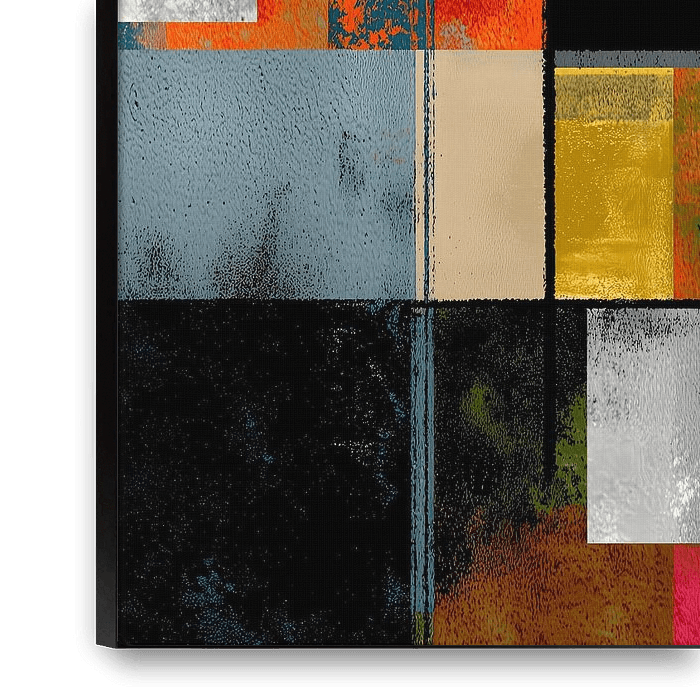 Une œuvre d'art abstraite présentant des formes géométriques dans des couleurs vibrantes. L'œuvre montre des carrés et des rectangles qui se chevauchent avec des textures et des nuances différentes, créant un jeu visuel dynamique. Certaines parties présentent un aspect altéré, ce qui ajoute de la profondeur et de l'intérêt à l'œuvre.