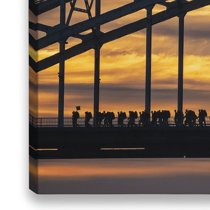 Le départ de la marche de quatre jours de Nimègue. Tôt le matin, les marcheurs traversent le pont Waal de Nimègue à l'aube. Ils commencent leur journée à Elst, parcourant une distance de 30, 40 ou même 50 kilomètres. Le fait de me lever très tôt m'a permis de prendre cette photo de manière à ce que la silhouette du pont et des…