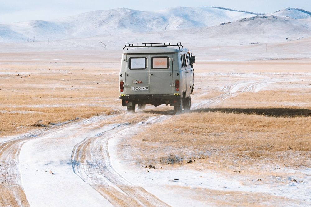 Un 4x4 roule sur un étroit chemin de sable à travers la vaste steppe mongole. Les traces de pneus serpentent à travers le paysage et s’estompent peu à peu vers les collines enneigées à l’horizon. Dans cette immense étendue, les routes semblent quasi inexistantes, et l’on suit souvent simplement les traces laissées par les voyageurs…