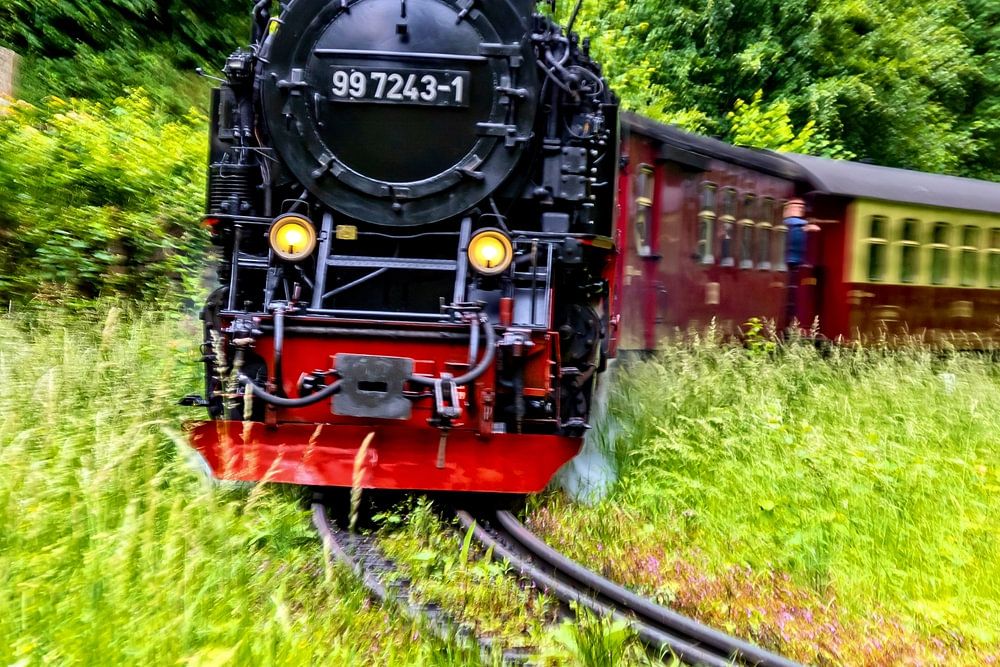 Un train de voyageurs des chemins de fer à voie étroite du Harz en route vers le plateau du Brocken. Ici, il passe juste devant l'ancienne gare de chargement de la vallée de Thumkuhl. Dans plus de cinquante minutes, il arrivera à la gare la plus haute que les chemins de fer à adhérence peuvent atteindre en Europe.