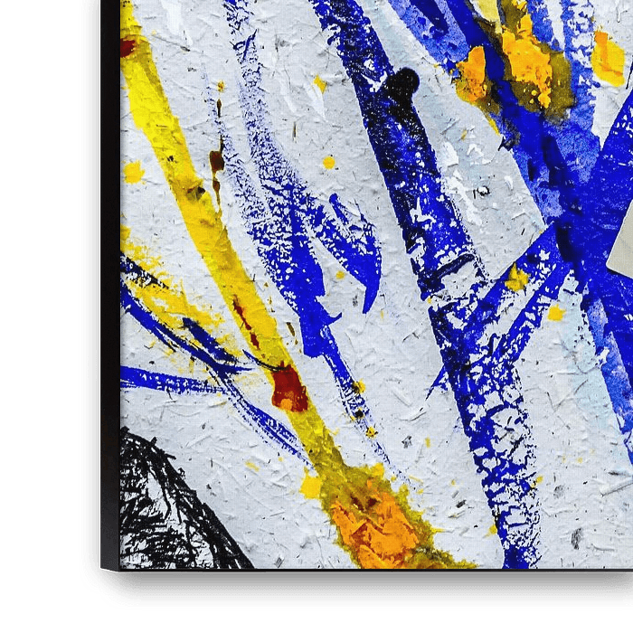 Cette image capture l'essence de l'art abstrait grâce à une combinaison captivante de couleurs et de textures. L'arrière-plan présente un motif dynamique de coups de pinceau bleus et jaunes, qui semblent danser sur la toile. Les couleurs vives et les coups de pinceau spontanés, presque explosifs, évoquent un sentiment d'énergie et de mouvement. Sur ce fond se trouve une partition de musique, offrant un contraste intrigant entre le monde structuré de la notation musicale et l'expression libre de la peinture abstraite. Cette œuvre invite le spectateur à s'interroger sur la relation entre l'ordre et le chaos, entre la beauté structurée de la musique et la créativité débridée de l'art abstrait.
