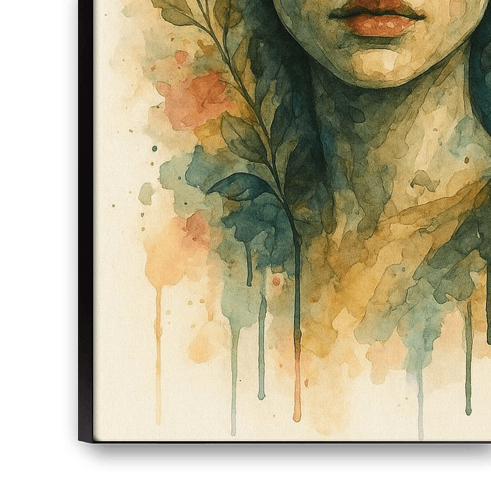 Cette œuvre étonnante est un portrait expressif à l'aquarelle capturant le regard intense d'une femme encadrée par un feuillage vert luxuriant et des fleurs délicates. L'œuvre utilise une technique libre et fluide, caractérisée par des lavis transparents, des saignées de couleur intentionnelles et des coulures de peinture frappantes le long du bord inférieur, ce qui donne à l'œuvre un aspect dynamique et éthéré.