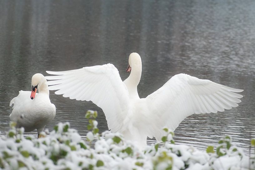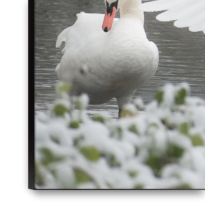 Sur cette œuvre, vous voyez deux cygnes au bord de l'eau. L'un est immobile, l'autre déploie ses ailes, non pas pour s'envoler, mais pour prendre de la place. Le mouvement semble contrôlé et prudent, presque hésitant. L'eau derrière eux est calme et lisse, ce qui fait ressortir davantage les formes blanches de leur environnement. Au premier plan, la neige adoucit l'image et ajoute une touche supplémentaire de silence et de vulnérabilité. Ce moment s'est produit sans préparation. Ce n'était pas un geste dramatique, mais un bref mouvement qui, précisément par sa simplicité, est resté gravé dans les mémoires. Les ailes déployées ne semblent pas grandioses ou imposantes, mais plutôt protectrices et conscientes. La présence du deuxième cygne renforce ce sentiment. Ensemble, ils forment un équilibre entre mouvement et calme, entre proximité et espace personnel. L'atmosphère de l'œuvre est calme et sobre. Malgré la tension physique des ailes déployées, l'image reste douce. La lumière hivernale et les couleurs limitées maintiennent l'ensemble léger et silencieux. Pour moi, cette œuvre traite du fait d'être ensemble sans s'éclipser l'un l'autre. Il s'agit de donner de l'espace et de prendre de l'espace, en étant attentif à l'autre. Dans un intérieur, cette image fonctionne comme une déclaration subtile. Elle apporte le calme, mais aussi un sentiment de connexion. Elle s'intègre bien dans un espace où le silence, la bienveillance et l'équilibre sont importants. Une œuvre qui ne crie pas, mais qui fait lentement ressentir quelque chose lorsque vous la regardez plus longtemps.